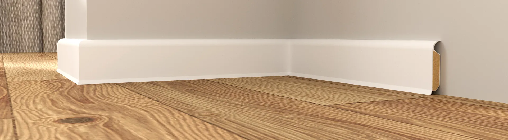 A room with a light wooden floor, smooth white baseboards, and a neutral wall, reflecting a minimalist and modern interior design.