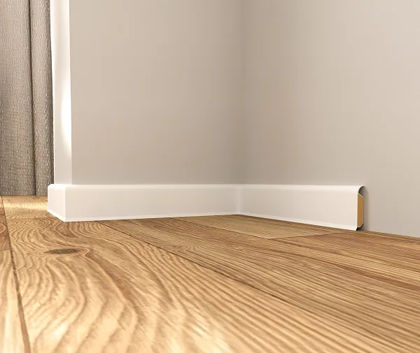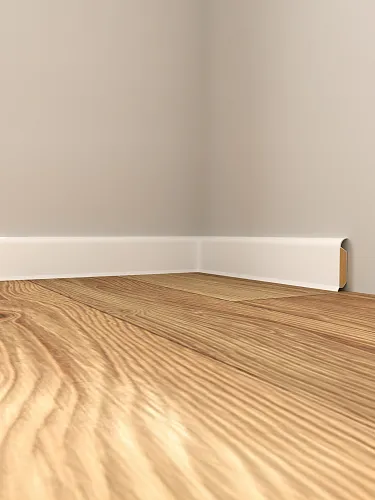 Modern skirting board with minimalist design along a wooden floor, blending seamlessly with the wall in a simple, elegant style.