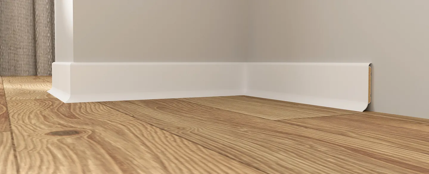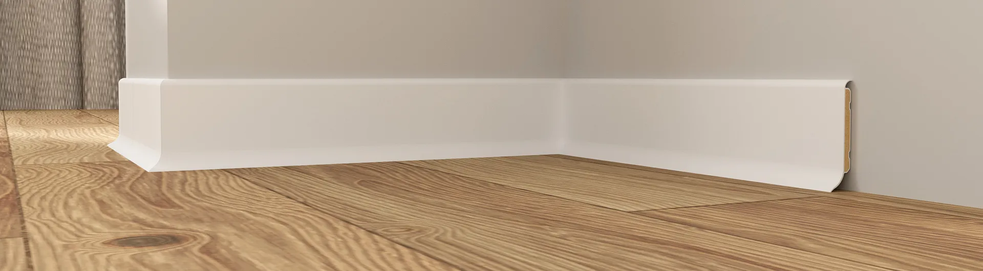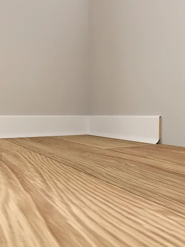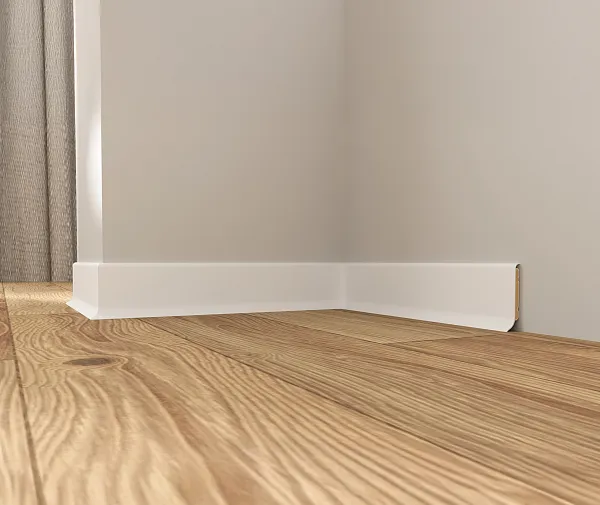 Modern skirting board with minimalist design along a wooden floor, blending seamlessly with the wall in a simple, elegant style.